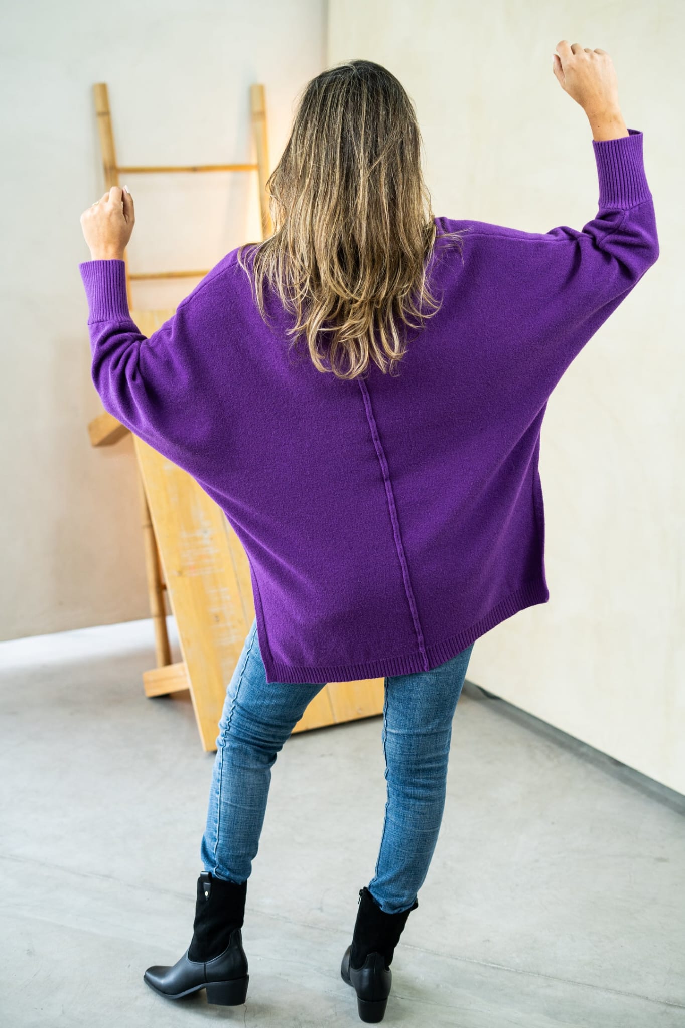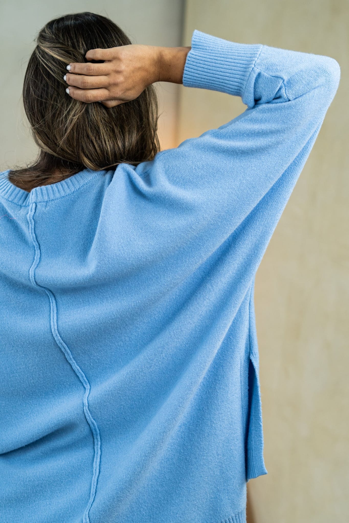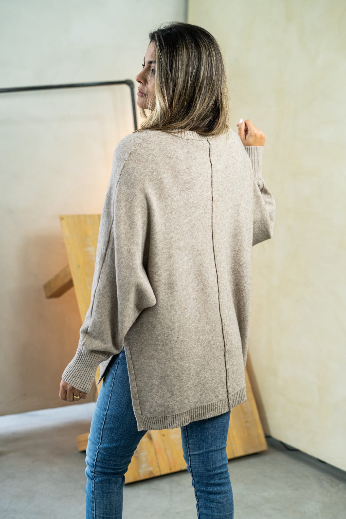 Buzo JULIETTE Tejido oversize Más largo atrás, detalles de aberturas a los lados. Único talle, con un estilo de mangas murciélago. Cont. Busto: 140cm a más