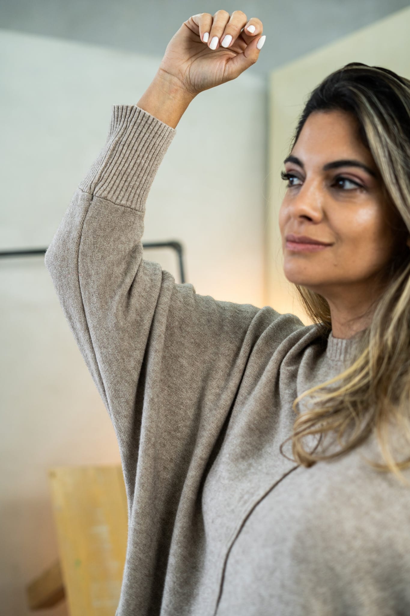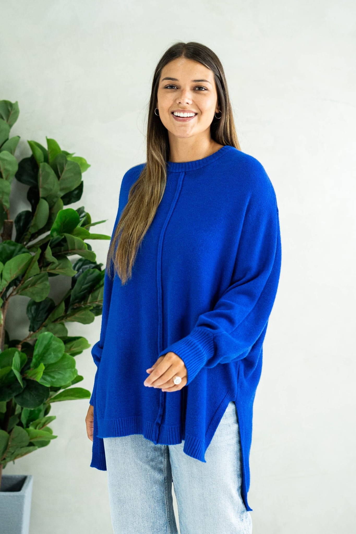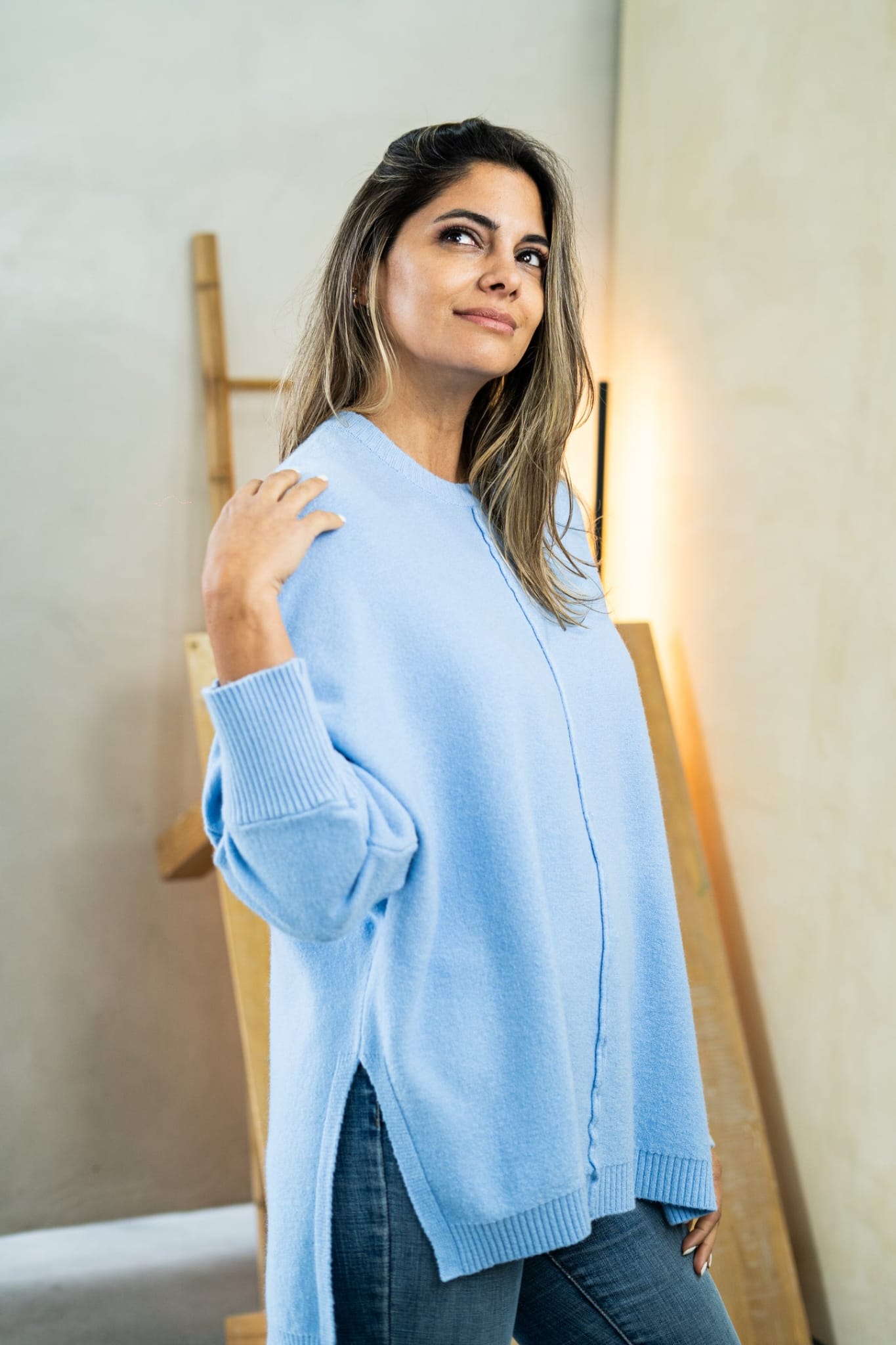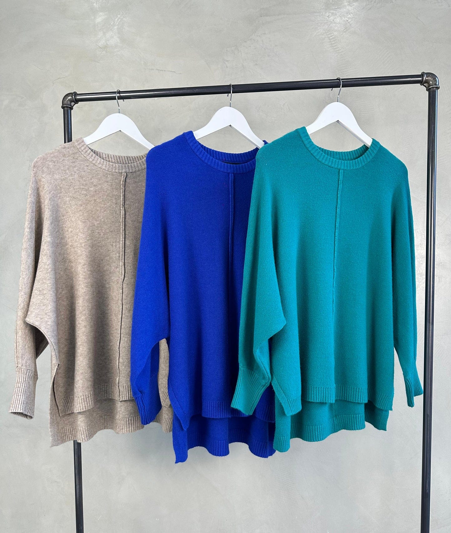 Buzo JULIETTE Tejido oversize Más largo atrás, detalles de aberturas a los lados. Único talle, con un estilo de mangas murciélago. Cont. Busto: 140cm a más