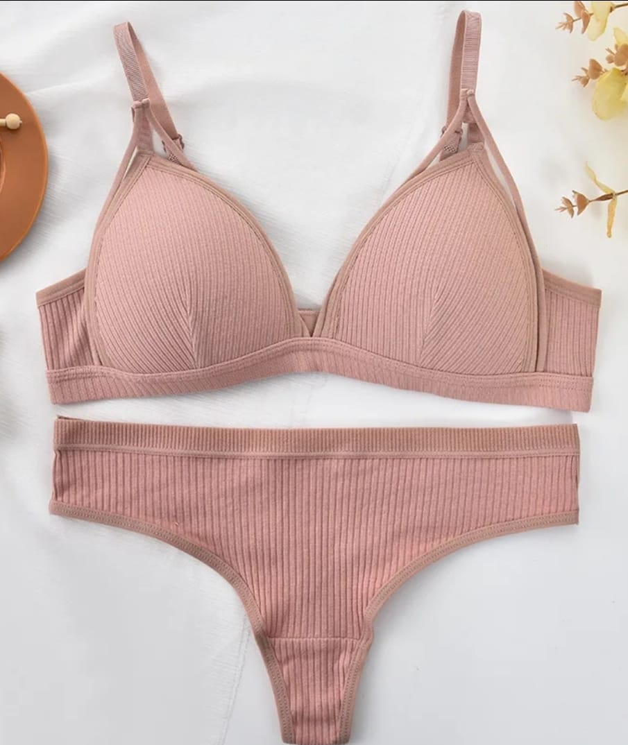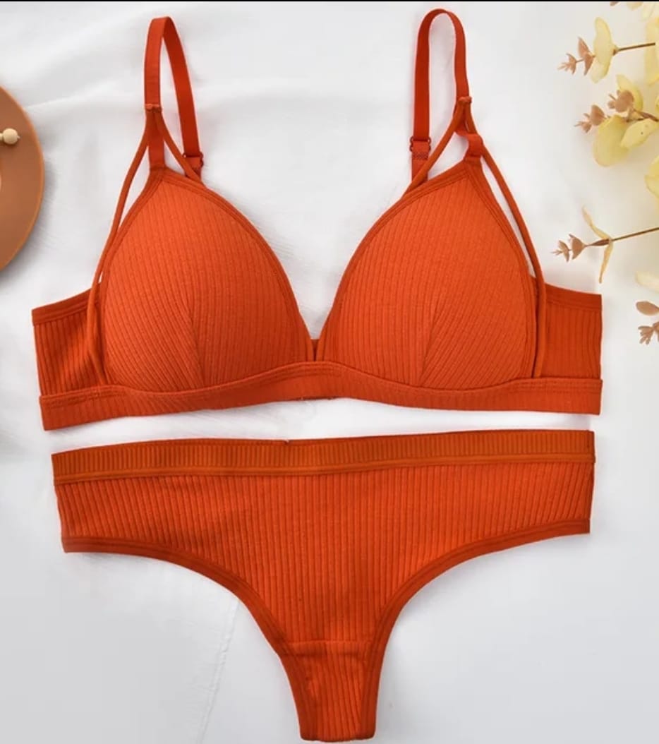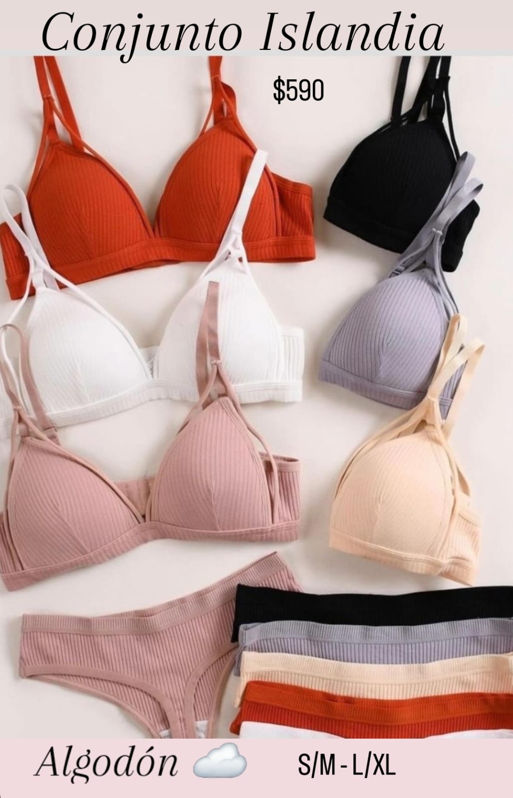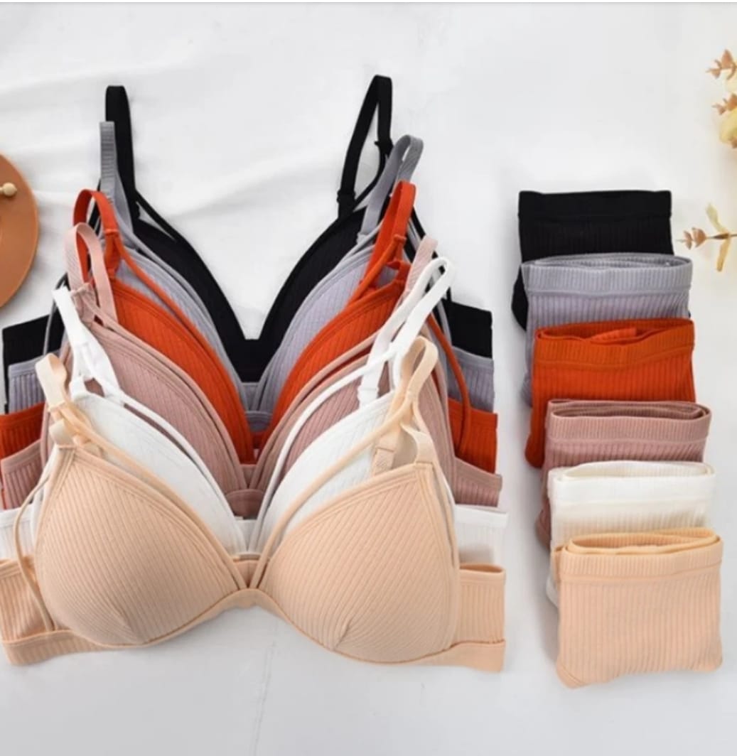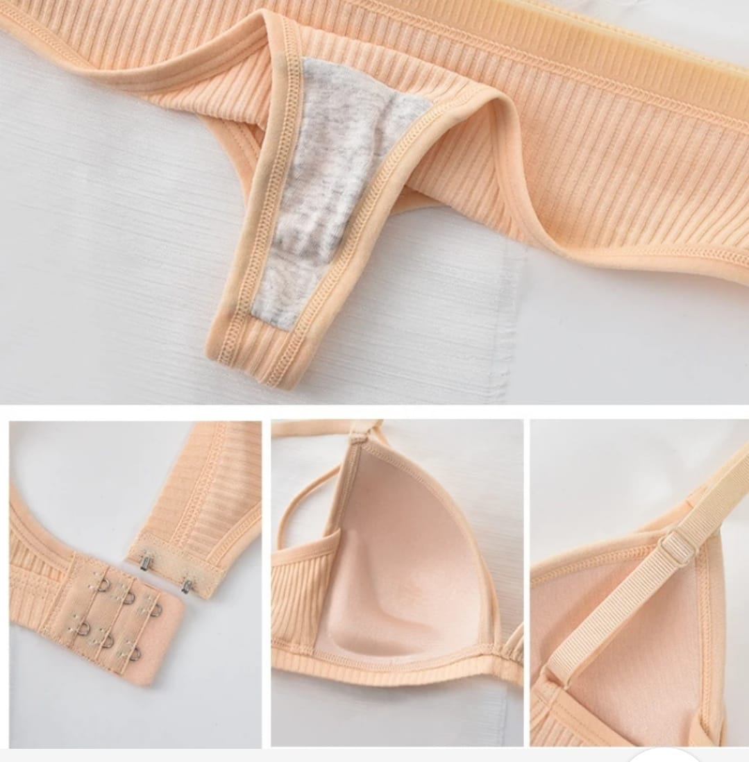 De algodón ☁️ Sostén con bretel regulable, con push up, sin aro. Prendido atrás. Material suave, flexible, transpirable. Colaless de algodón. 🌈 6 Colores Talle: S/M- L/XL Talle 1 : S/M = 80-85 Talle 2 : L/XL= 90-95